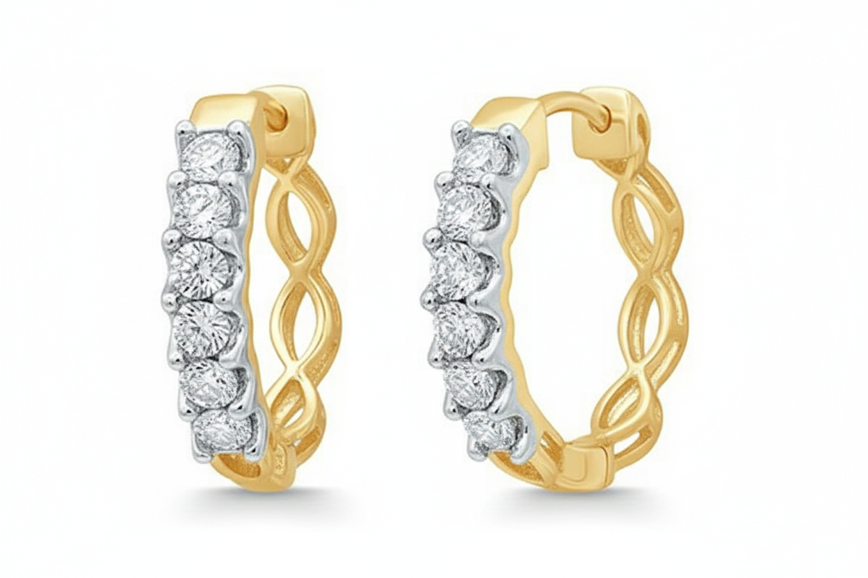 Women's Earrings Gemma feature 10K yellow gold crafted into modern small hoops, adorned with 38 sparkling round diamonds totaling 0.15 carats.