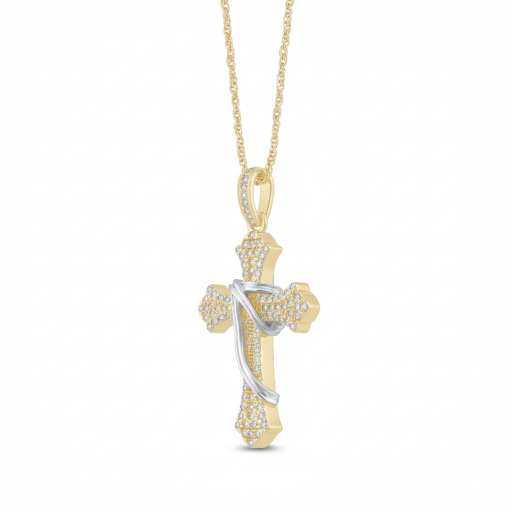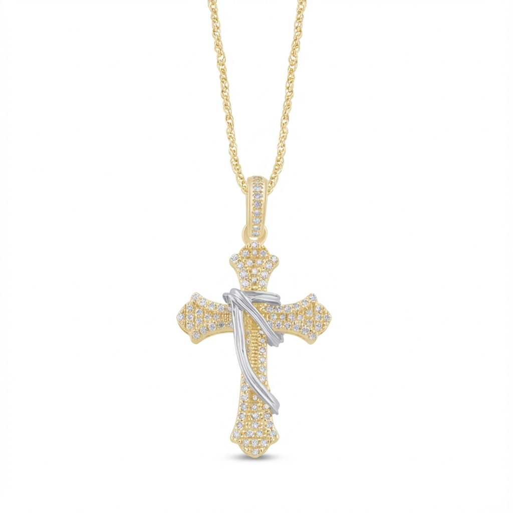 Religious Unisex Pendant Chris-3 with a Cross and Ribbon design, crafted in 10K yellow and white gold and studded with 0.15CTW diamonds.
