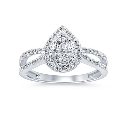 Women's Ring Samantha is crafted in 10K white gold and features a teardrop halo set with 59 straight baguette and round diamonds totaling 0.34 carats. Its sleek design and eye-catching shimmer offer a look that’s both elevated and exclusive.