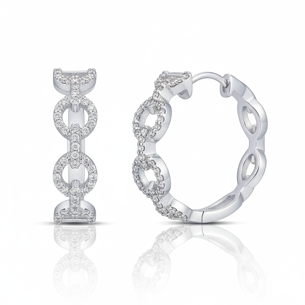 The Kamila earrings feature a sleek chain link design in 10K white gold, with 0.34CTW of diamonds adding just the right amount of shine to their classic huggie hoop shape.