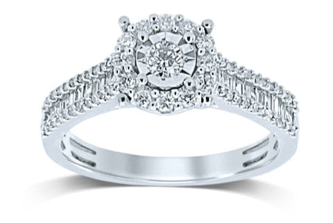 Women's Ring Mila is crafted in radiant 10K white gold and features a captivating halo design adorned with 81 diamonds totaling 0.43 carats. A refined mix of straight baguette and round diamonds creates a brilliant sparkle, making this piece a true statement of elegance.