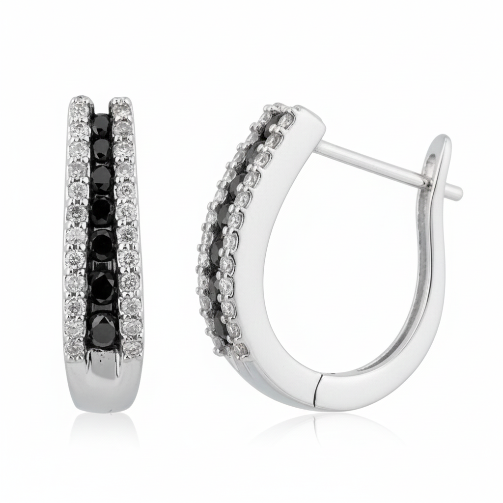 Women's Earrings Nina are a captivating blend of classic charm and contemporary flair. Expertly crafted in 10K white gold, these hoop earrings feature a striking combination of 0.56 carats of sparkling white and treated black diamonds, creating a bold contrast that’s both modern and glamorous.