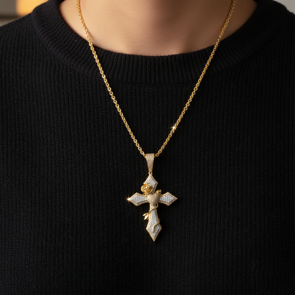 Religious Unisex Pendant Chris-1 features a vintage-style cross and rose design, and is crafted in 10KT yellow gold and set with 0.67 carats of diamonds.