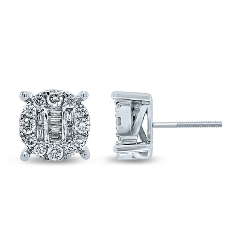 Women's Earrings Scarlett showcase a refined design in 10K white gold, adorned with 0.87 carats of round and baguette diamonds meticulously set in an elegant flower like pattern.